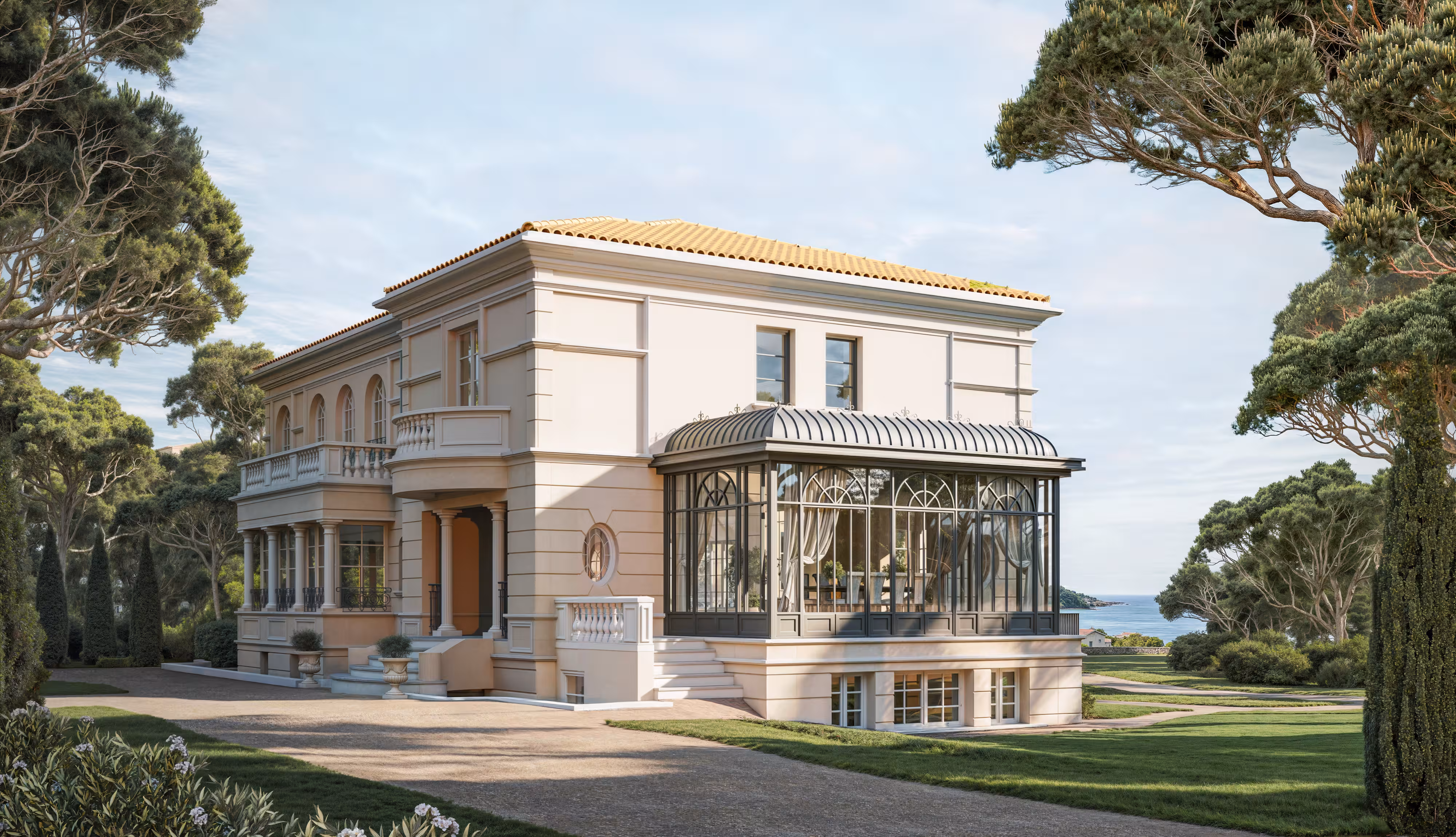 Cap d'Antibes doesn't forgive mediocrity. We visualised the complete renovation of this exceptional estate — classical facades, gold-touched interiors, and a sense of permanence that only the finest properties carry. Built to last. Rendered to perfection.